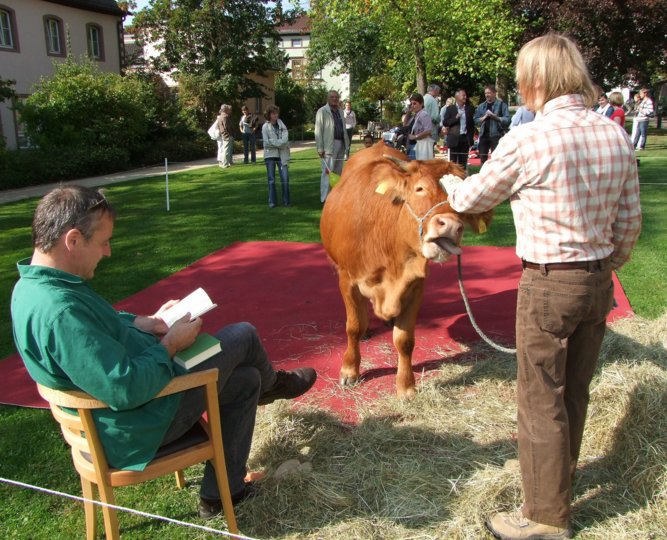 Kunstaktion mit Kuh Lilli auf dem roten Teppich