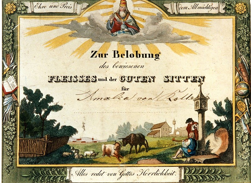„Überzeugt, daß die der Schul-Jugend bei öffentlichen Prüfungen ertheilten Prämien (meist Bücher) eines der wirksamsten Mittel zu Belebung des Fleißes, der Nacheiferung und des besten Fortganges des Schul-Unterrichtes seyen, - haben Wir die in dieser Hinsicht in dem Vizedom-Amte Aschaffenburg schon vor mehreren Jahren getroffene Anordnung nicht nur zu erneuern, sondern auch auf alle Gemeinheiten (= Gemeinden) des Fürstenthums auszudehnen für zweckmäßig und räthlich gefunden; - verordnen daher: